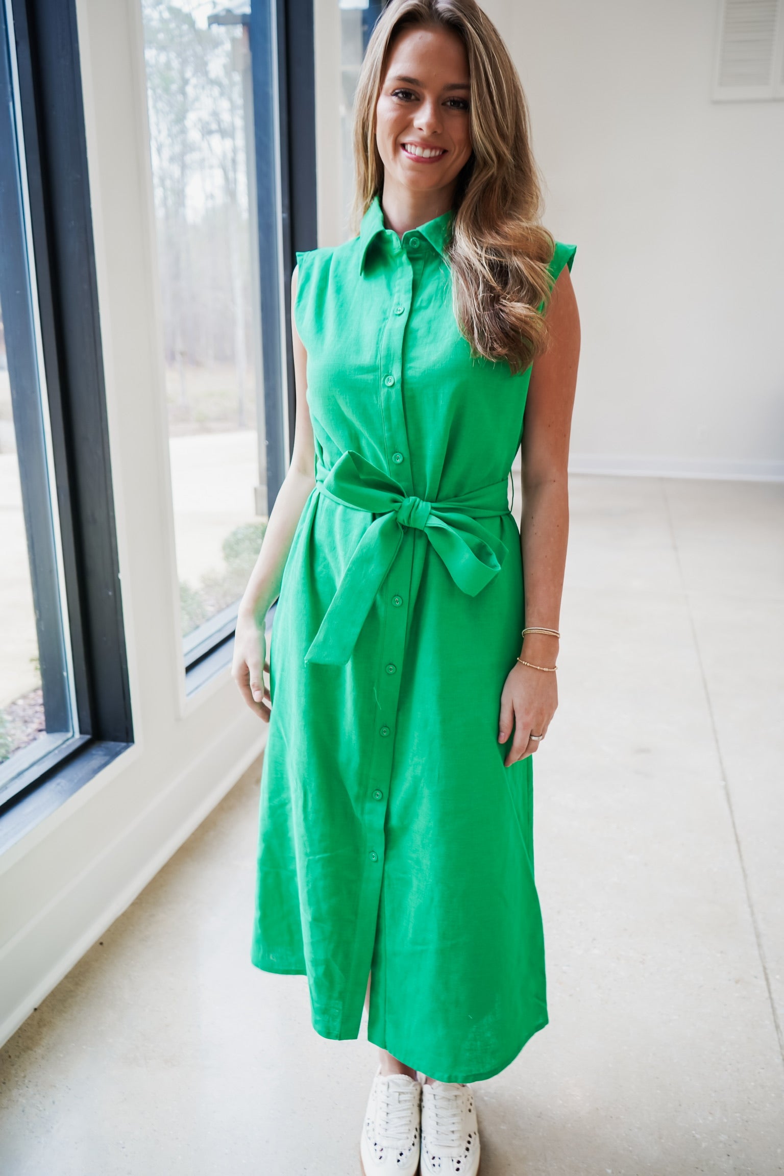 DOLCE CABO Linen Belted Button Down Maxi Dress - Green