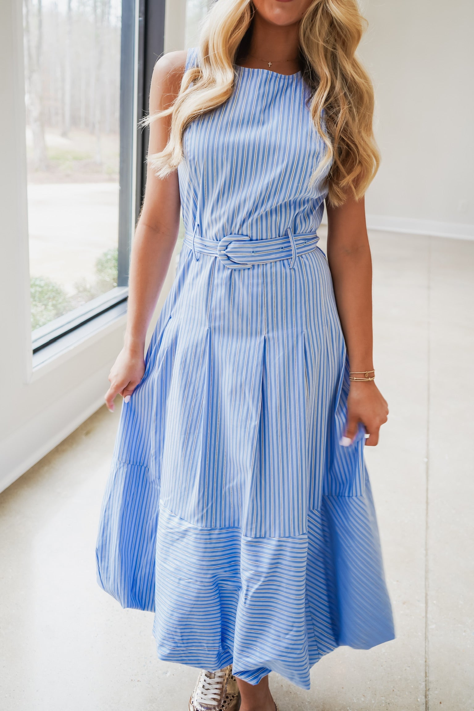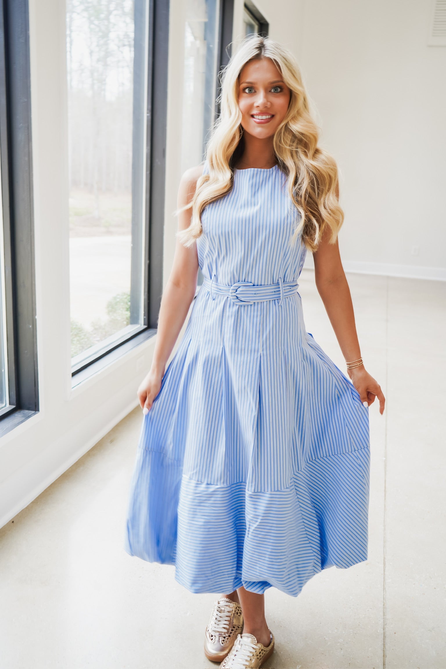 DOLCE CABO Poplin Stripe Belted Bubble Maxi Dress
