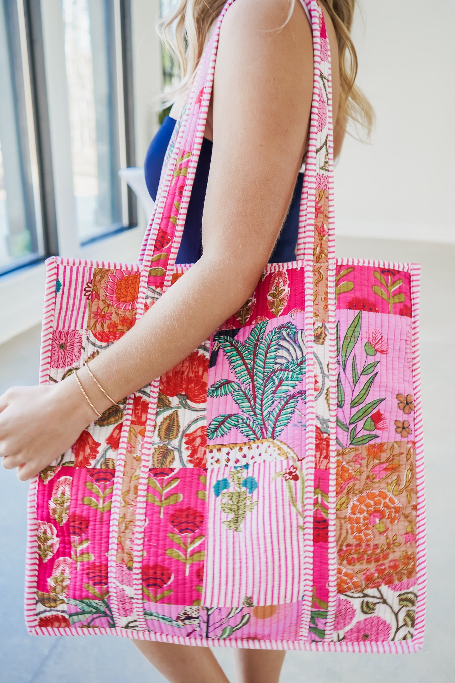 Carry your essentials in style with this stunning quilted tote bag crafted from 100% cotton! The exterior showcases an eye-catching floral print in vibrant hues, while the interior features a contrasting stripe pattern paired with a matching floral printed side pouch—perfect for organizing smaller items. Reinforced long straps make it comfortable for everyday wear, whether you're heading to the market, beach, or office. The open design offers easy access without the fuss of zippers, giving you a versatile bag that combines practicality with undeniable charm.