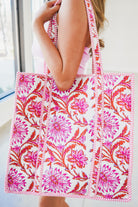 Carry your essentials in style with this stunning quilted tote bag crafted from 100% cotton! The exterior showcases an eye-catching floral print in vibrant hues, while the interior features a contrasting stripe pattern paired with a matching floral printed side pouch—perfect for organizing smaller items. Reinforced long straps make it comfortable for everyday wear, whether you're heading to the market, beach, or office. The open design offers easy access without the fuss of zippers, giving you a versatile bag that combines practicality with undeniable charm.