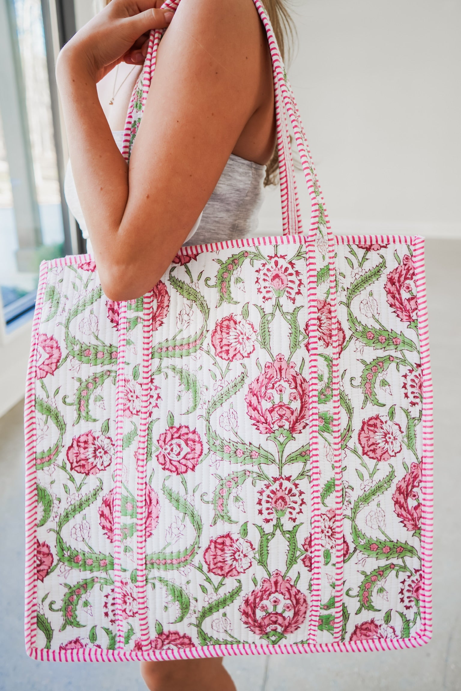 Quilted Tote Bag - White/Pink/Sage