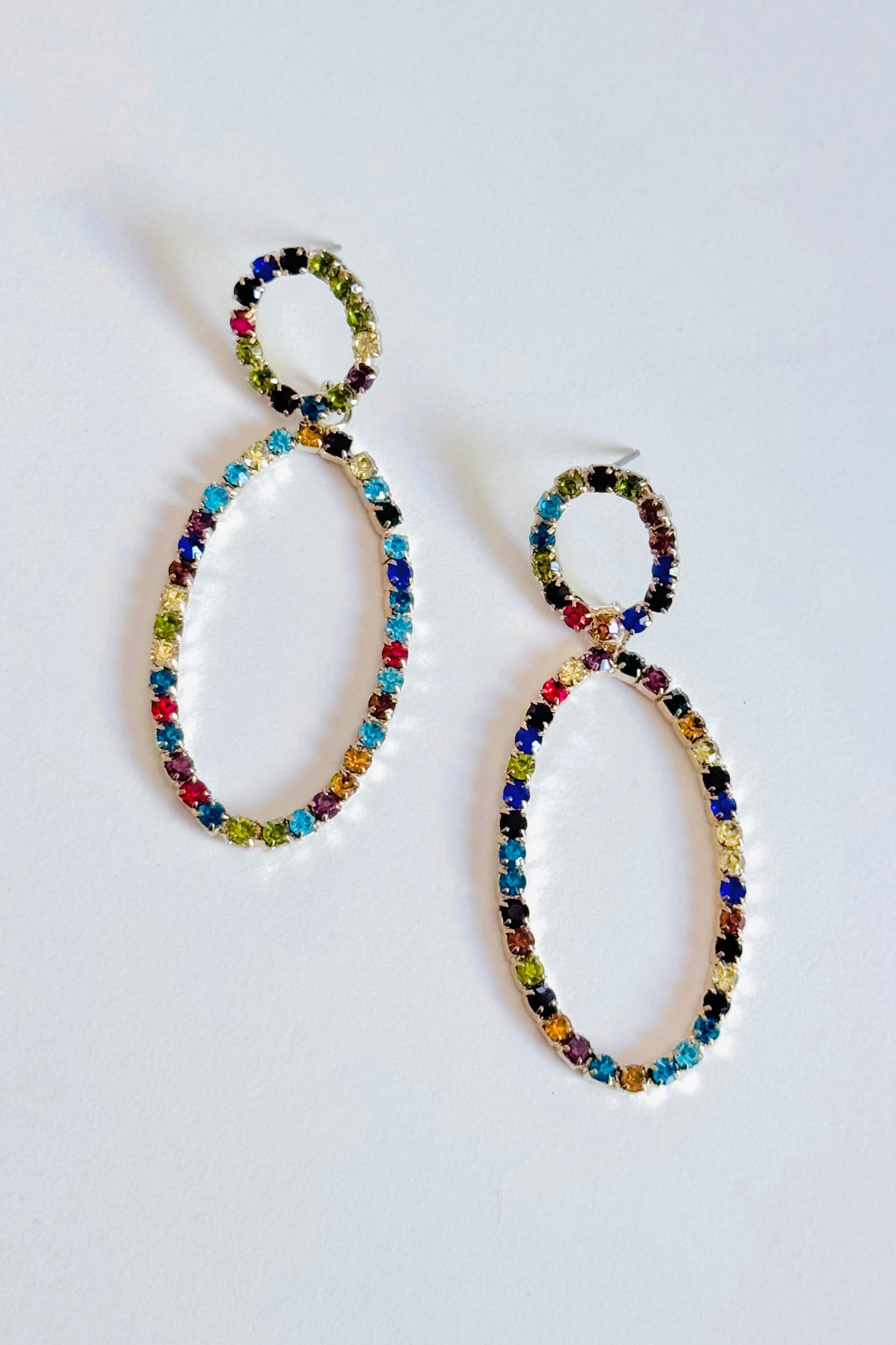 Add some color and shine to your look with our Rainbow Oval Hoops. Featuring bold open ovals adorned with rainbow crystal rhinestones, these hoops are the perfect statement piece for risk-takers and adventure-seekers. Limited quantities available - get them now at a final sale price!