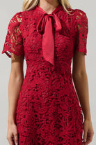 The Abilene Bow Crochet Mini Dress will have you ready for any special occasion. An adorable bow around the neck frames short pleated sleeves. The princess style skirt makes it fun and it back has an invisible zipper. Wear it with cute bow strappy heels to match your look.