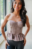 Turn heads with the Amelie Top —a strapless, sleeveless tube bustier featuring a flirty ruffle peplum hem. The ruched back panel and back zipper ensure a perfect fit, combining comfort with a playful, chic vibe. Perfect for nights out or stylish daytime looks.