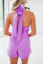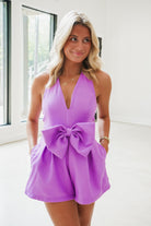 This sleeveless Angel Romper in soft lavender features a flattering low v-neckline and a charming bow waistband that accentuates your silhouette. Designed with convenient side pockets, it combines style and practicality for effortless elegance. Perfect for warm days or layering, this romper offers a comfortable yet chic look that stands out.