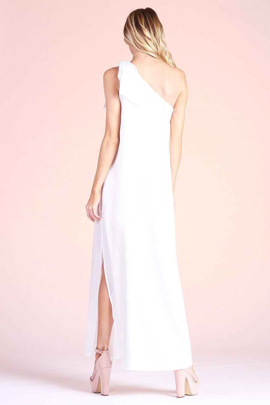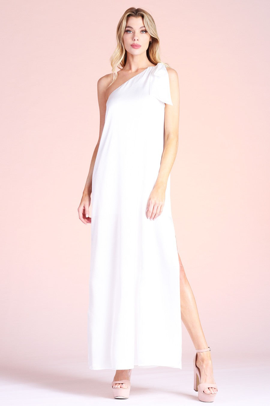 Slip into sophistication with the Arden Maxi Dress, where glamour meets comfort. This stunning white gown features a shiny hammered satin fabric that catches the light beautifully, paired with a chic one-shoulder tie design that's equal parts elegant and fun. Soft yet structured, it's your secret weapon for any occasion—from beach getaways and weddings to work events and late-night galas. One dress, endless possibilities, zero regrets.