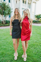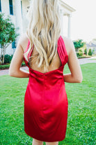 Make a bold statement in the Arielle Mini Dress, a playful fusion of elegance and flirtiness. This sleeveless, strapless red satin slip dress features a halter neckline that draws eyes upward, while the open back with button neck closure adds a daring touch. Its mini length keeps the look fresh and fun, perfect for nights when you want to shine with ease and confidence.