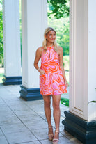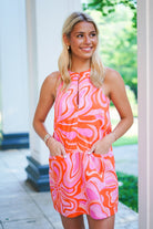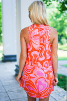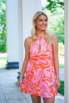 Embrace the vibrant energy of the 70's with our Arin Mini Dress! This stunning shift dress features a playful pink and orange floral print and a stylish front keyhole detail. Stay hands-free with convenient pockets and rock the mod look with sleeveless design. Perfect for making a statement and turning heads.