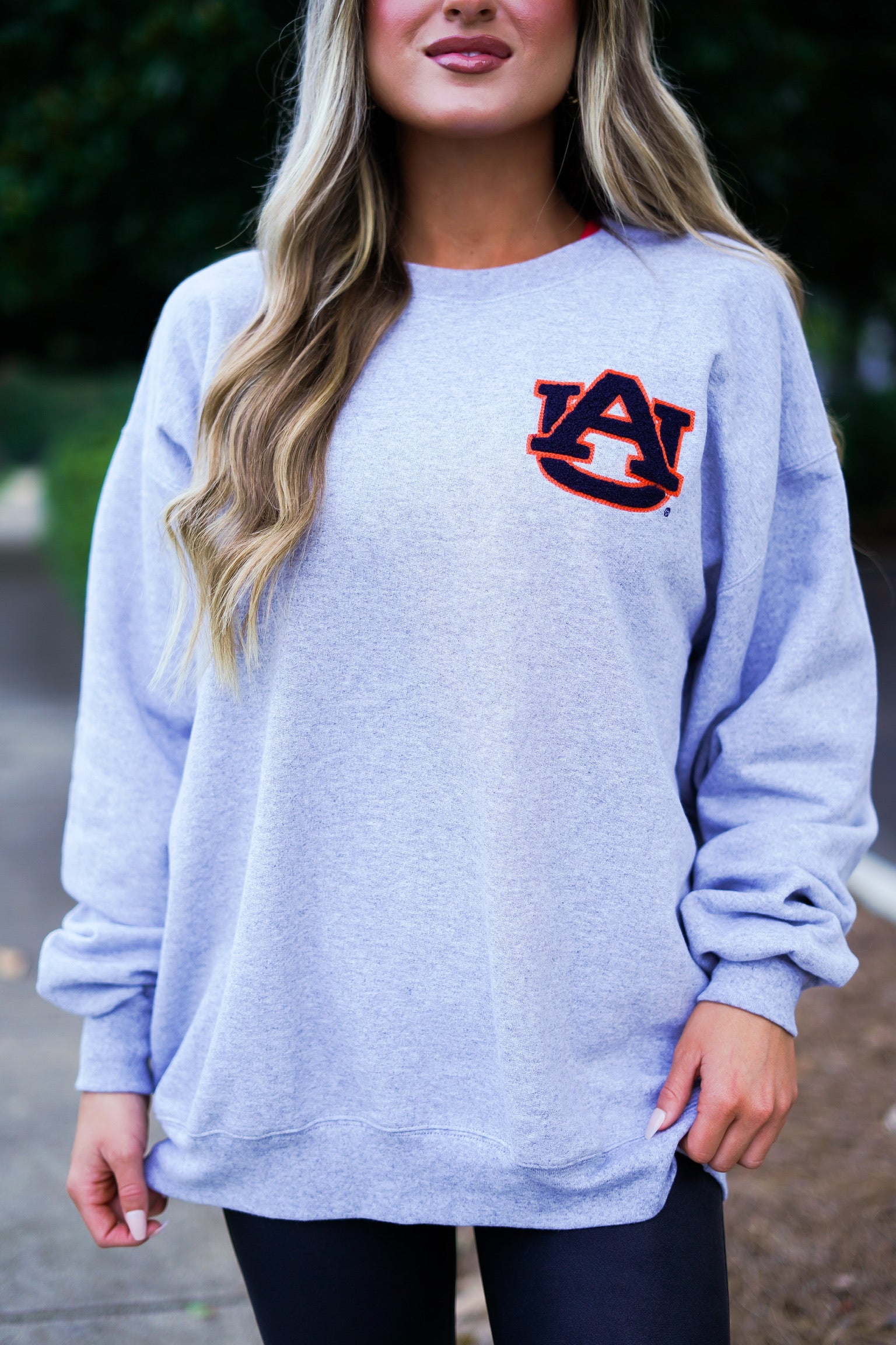 Get ready to show off your team pride with our Auburn Patch Sweatshirt! This heather grey oversized crewneck sweatshirt is not only comfortable and stylish, but also features the classic Auburn chenille embroidered patch. Perfect for game day or everyday wear, this sweatshirt is a must-have for any Auburn fan. War Eagle!