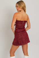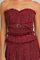 Turn heads in the Augustine Top - Burgundy, a playful twist on classic elegance. This tweed strapless crop top combines chic texture with a flirty silhouette, perfect for showing off sun-kissed shoulders and a confident vibe. Pair it with high-waisted jeans or a skirt for a look that’s both bold and effortlessly stylish.