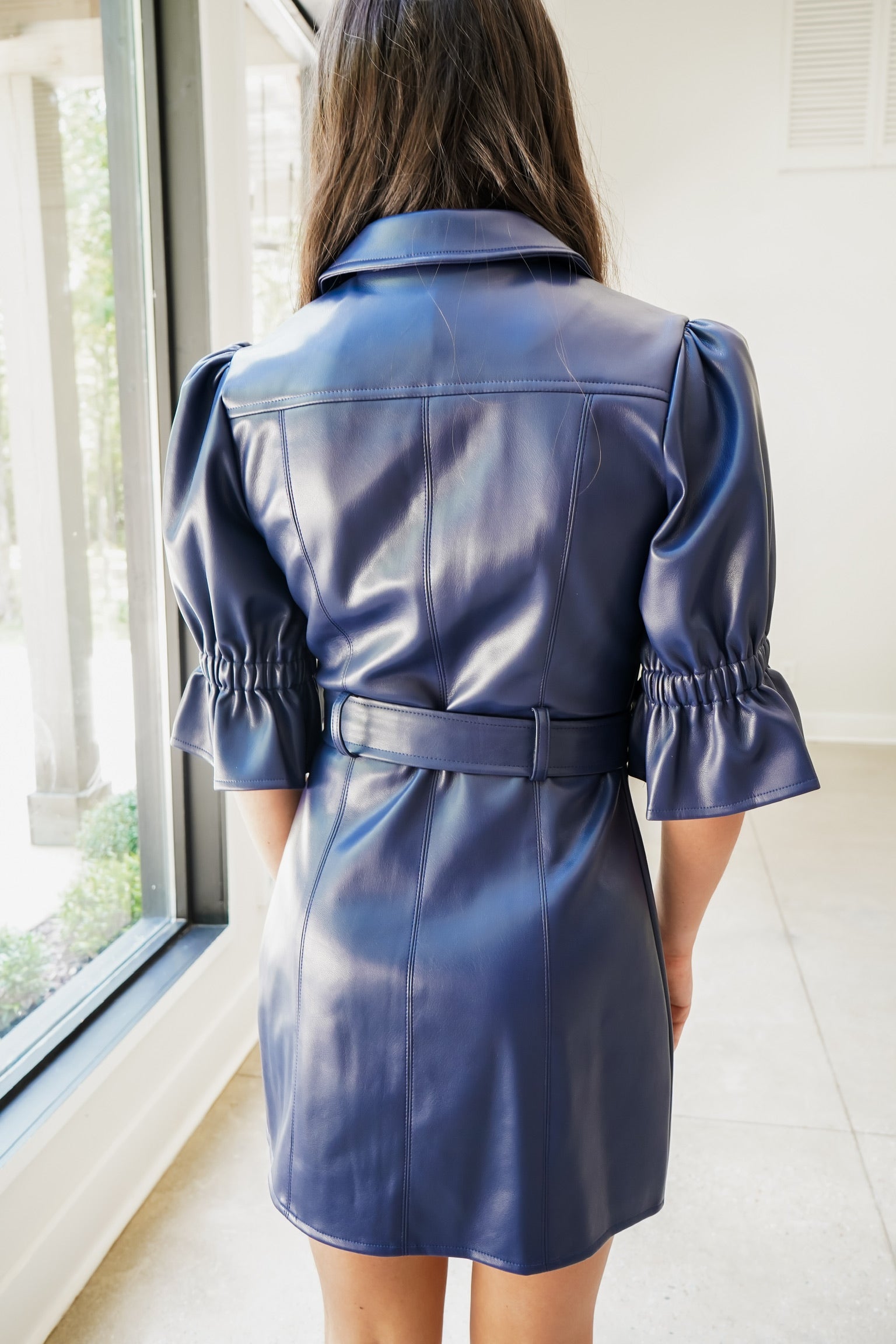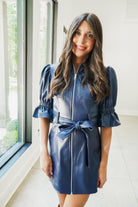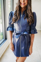 Turn heads in this playful vegan leather mini dress featuring trendy 3/4 length puff sleeves and a chic collared neckline. The full front zipper adds an edgy touch, while the belted waistline sash cinches your silhouette for a flattering fit. Perfect for making bold statements wherever you go!