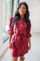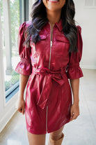 Turn heads in this playful vegan leather mini dress featuring trendy 3/4 length puff sleeves and a chic collared neckline. The full front zipper adds an edgy touch, while the belted waistline sash cinches your silhouette for a flattering fit. Perfect for making bold statements wherever you go!