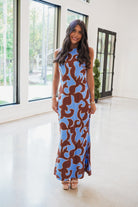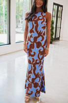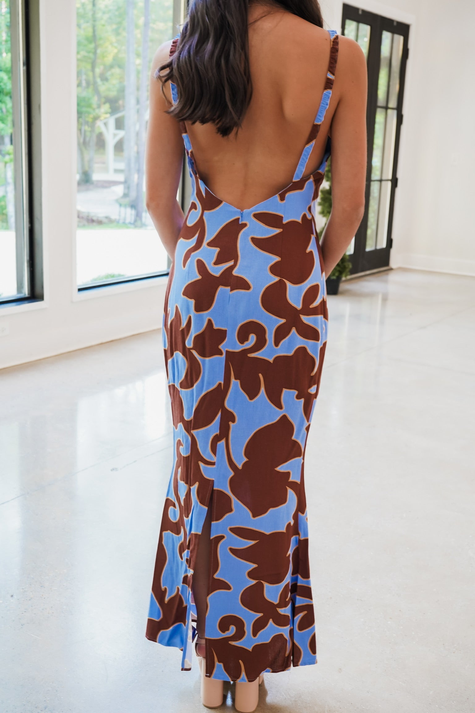 Turn heads in the Briley Maxi Dress, a playful blend of bold and elegant. This sleeveless, strapless dress features a high boat neckline and a low open back for a flirty touch. The blue fitted silhouette is beautifully accented with a brown abstract print, making it perfect for summer soirées or stylish daytime adventures!