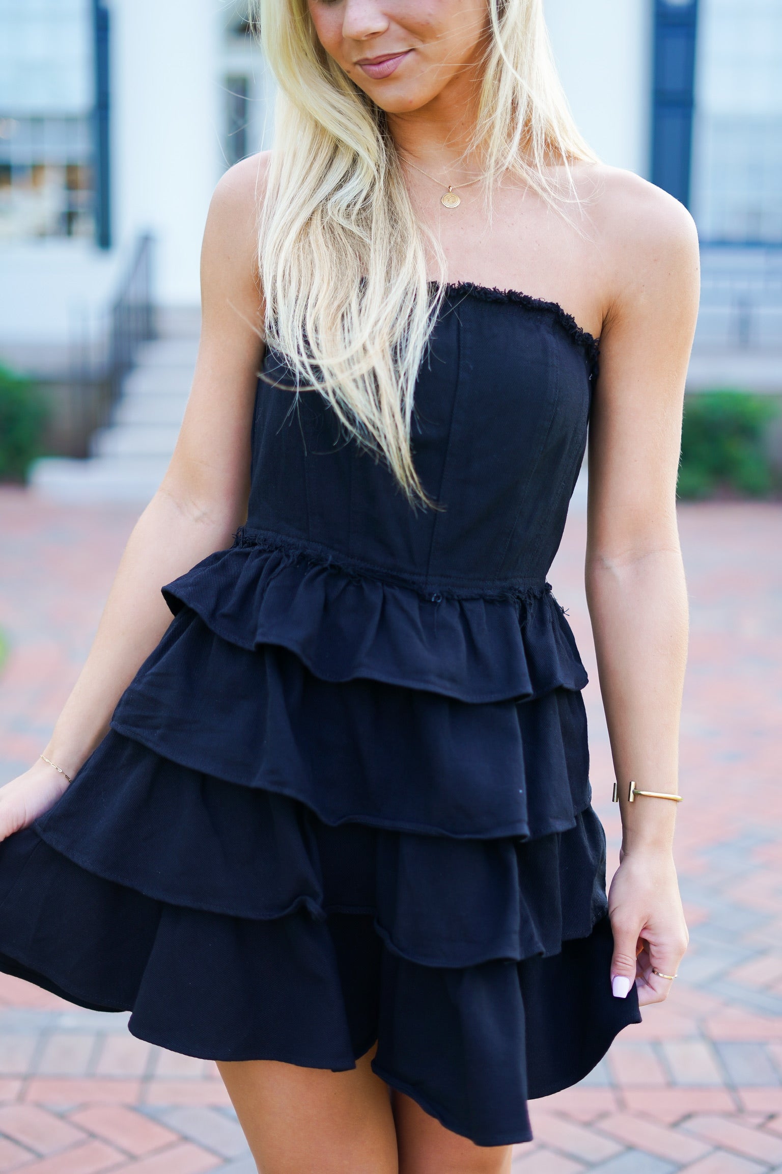 Transform your wardrobe with the Cartia Dress! This strapless denim mini dress features a stylishly ruffled, layered skirt that will elevate your look and make you stand out. Perfect for any occasion, this dress is a must-have for your fashion-forward collection.