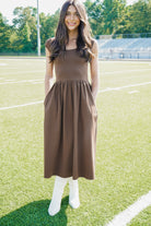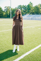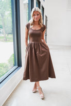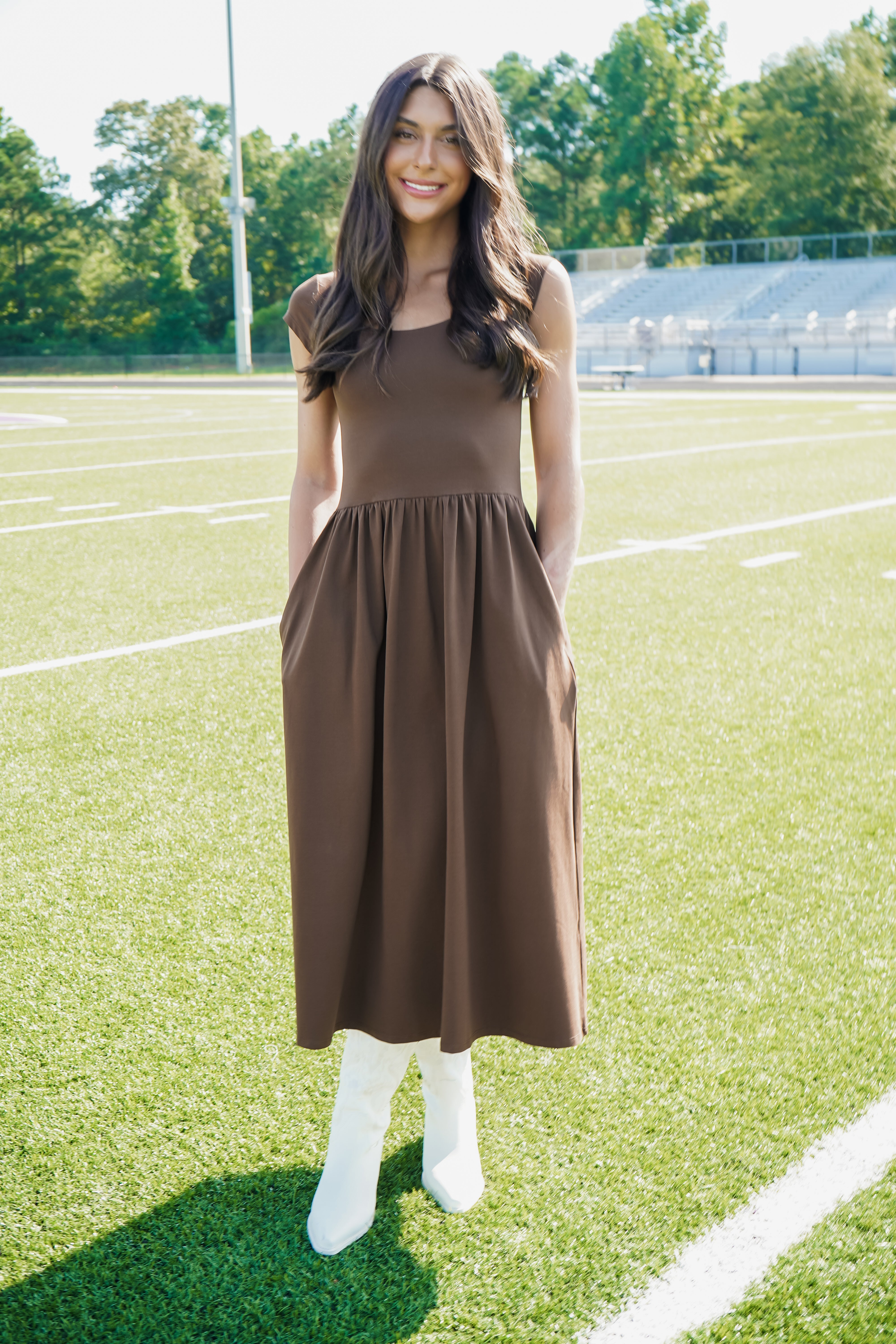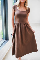 Slip into the Celestia Midi Dress for effortless charm! This playful piece features a comfy t-shirt style bodice with cute cap sleeves and a scoop neckline that's just right for showing off your favorite necklace. The flowy midi skirt swishes delightfully with every step, while hidden side pockets hold your little secrets! Ruched pleats at the waistline create a flattering silhouette that hugs in all the right places. Your new go-to dress for dancing through your day!