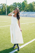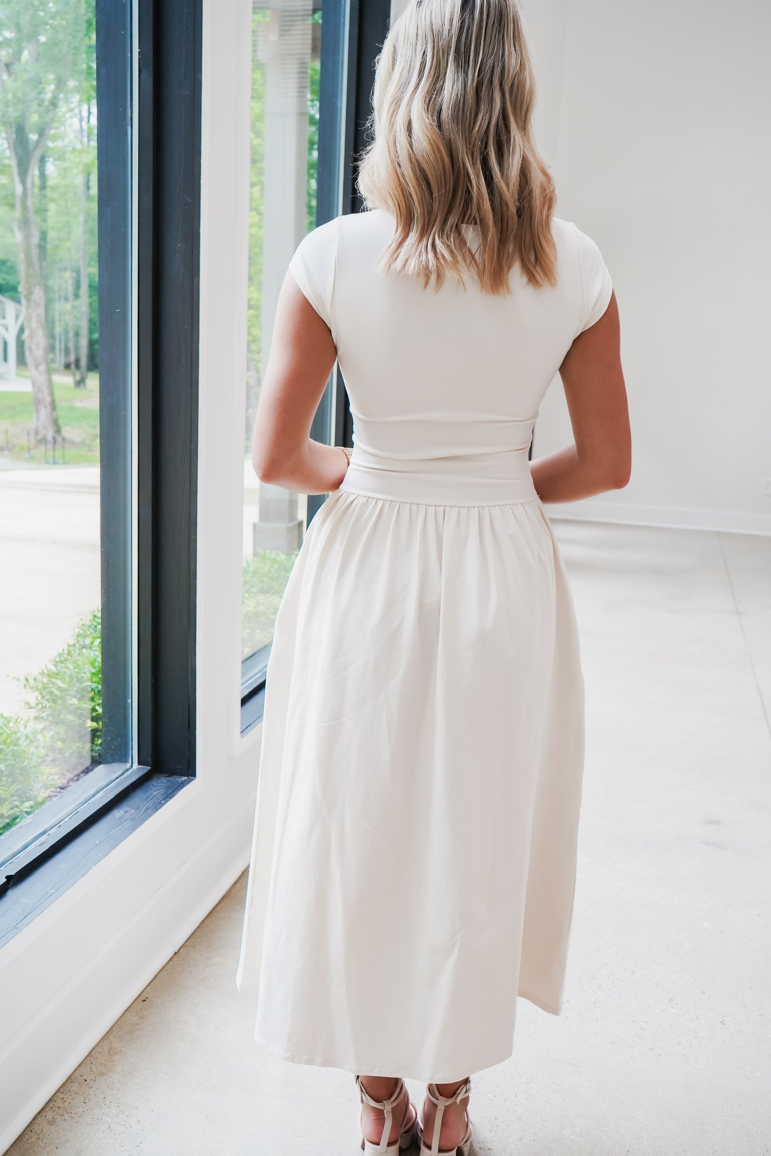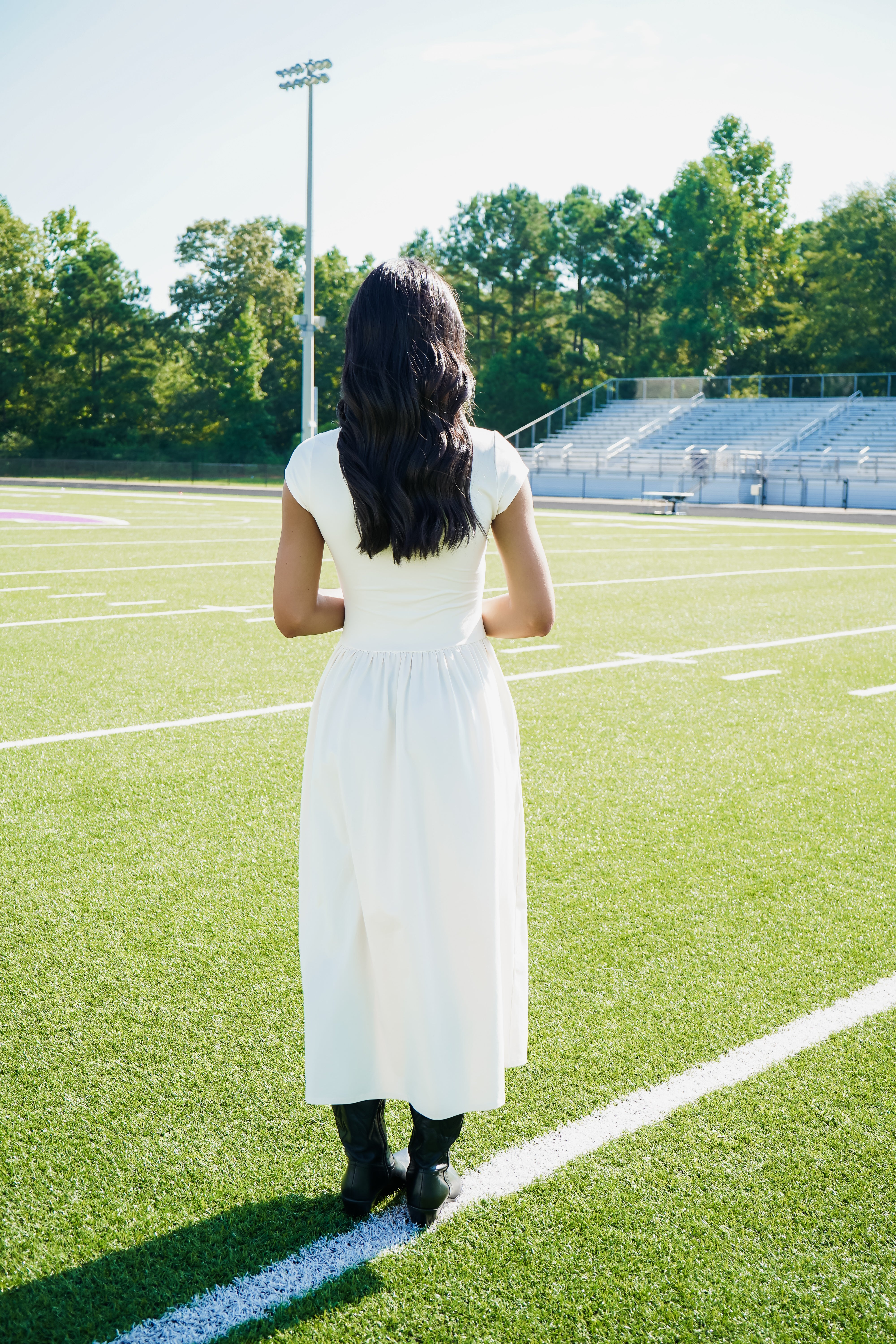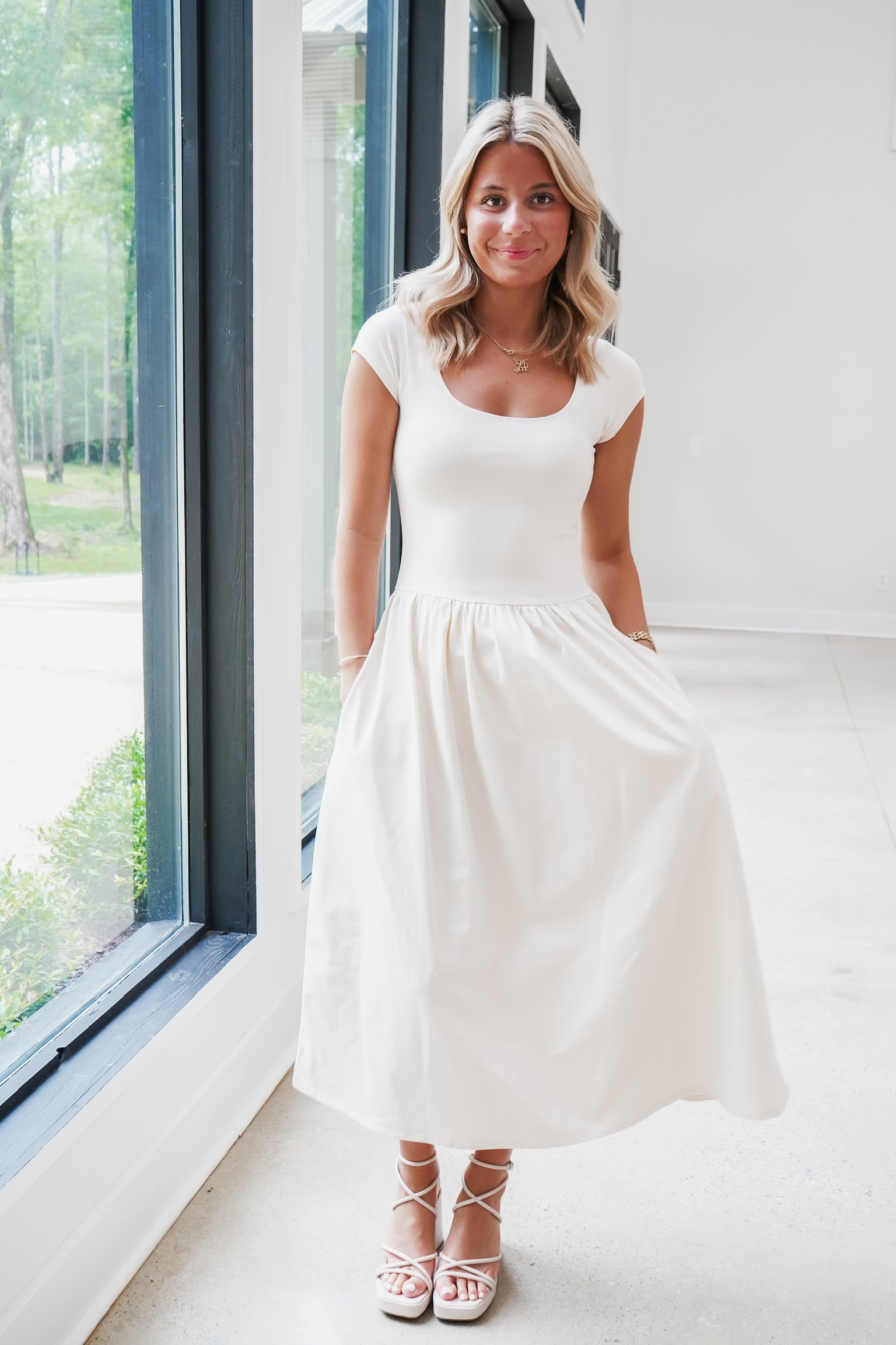 Slip into the Celestia Midi Dress for effortless charm! This playful piece features a comfy t-shirt style bodice with cute cap sleeves and a scoop neckline that's just right for showing off your favorite necklace. The flowy midi skirt swishes delightfully with every step, while hidden side pockets hold your little secrets! Ruched pleats at the waistline create a flattering silhouette that hugs in all the right places. Your new go-to dress for dancing through your day!