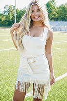 Elevate your style with the Ciara Skirt, a chic ivory fitted mini skirt designed to flatter your silhouette. Featuring a unique asymmetrical gold loop belt and eye-catching diagonal fringe hem, this skirt adds a touch of sophistication and movement to any outfit. Perfect for making a statement at events or nights out, the Ciara Skirt combines elegance with modern edge effortlessly.