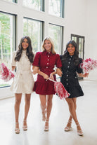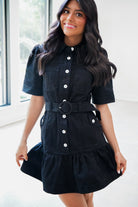 Step out in style with the Dallas Mini Dress! This playful dress features a collared neckline and short sleeves, perfect for warm days. The full front button closure adds a classic touch, while front pockets bring practical charm. A belted waistline highlights your silhouette, and the tiered ruffle skirt adds flirty movement for a fun, feminine look. Ideal for casual outings or lively gatherings, this dress combines comfort and flair effortlessly.