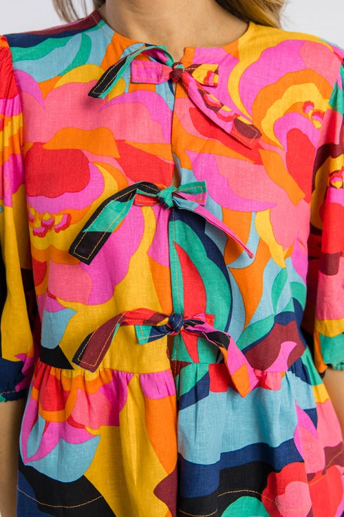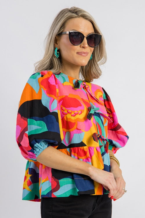 We're all about bold colors for Spring, and this top just gets it right. Crafted from a linen-blend fabric and bursting with fabulous color, it's ideal for taking on the season in style. The peplum silhouette features three adjustable ties down the split, open front. Puff sleeves complete the look.