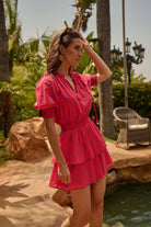 Step into a floral dream with this Delmas Floral Rai Ruffle Mini Dress. Featuring short puff sleeves and a split neck that adds a touch of sophistication. The ruffle skirt flows beautifully. Whether paired with sandals or heels, its effortless style makes it a go-to.