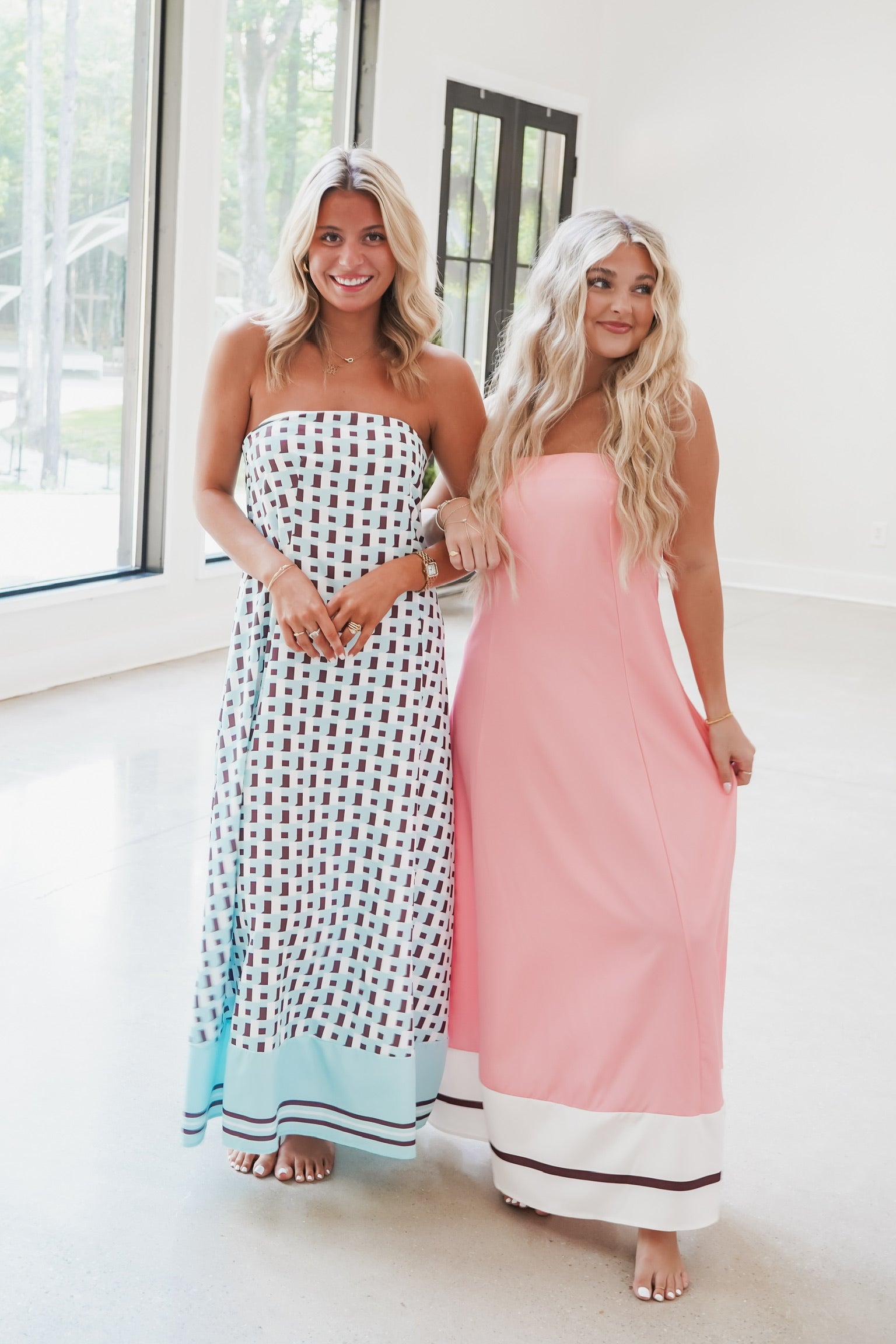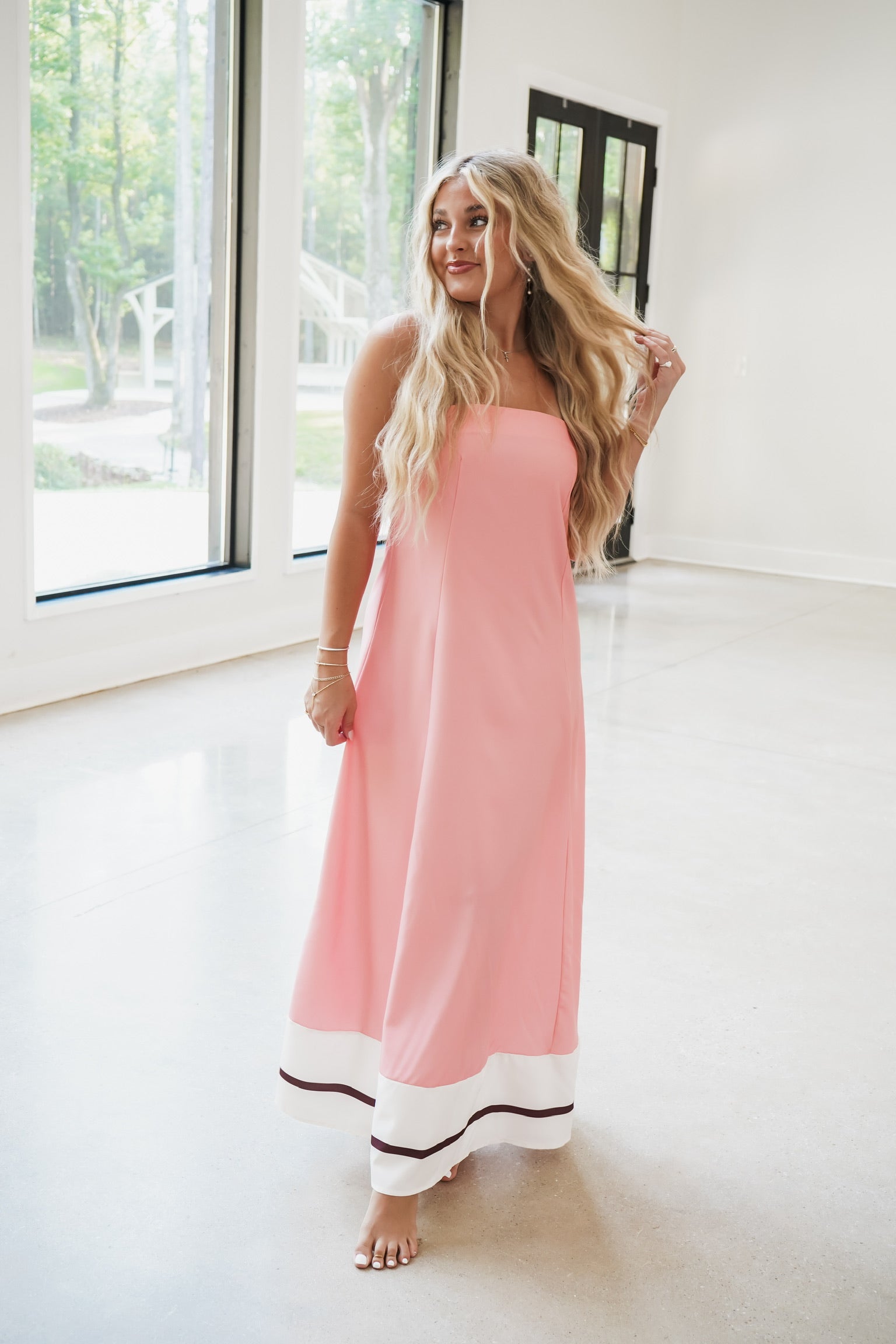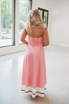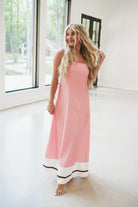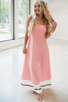 Embrace effortless style with the Dempsey Maxi Dress! This strapless, sleeveless dress features a solid baby pink color, bottom white and black stripe detail, and a flowy silhouette that moves with you. The elastic smocked back panel ensures a comfortable, secure fit while adding a touch of charm. Perfect for sunny days or evening strolls, this maxi dress brings fun and flair to your wardrobe.