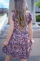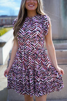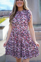 Get ready to turn heads in the Donovan Dress! Featuring a stunning multi red soft chevron print, this tiered dress gives off a playful and fun vibe. The short ruffle sleeves add a touch of femininity while providing comfort. Perfect for any occasion, this dress will make you feel confident and stylish. Don't miss out on this final sale item!