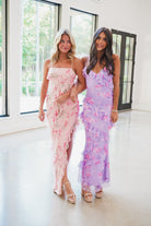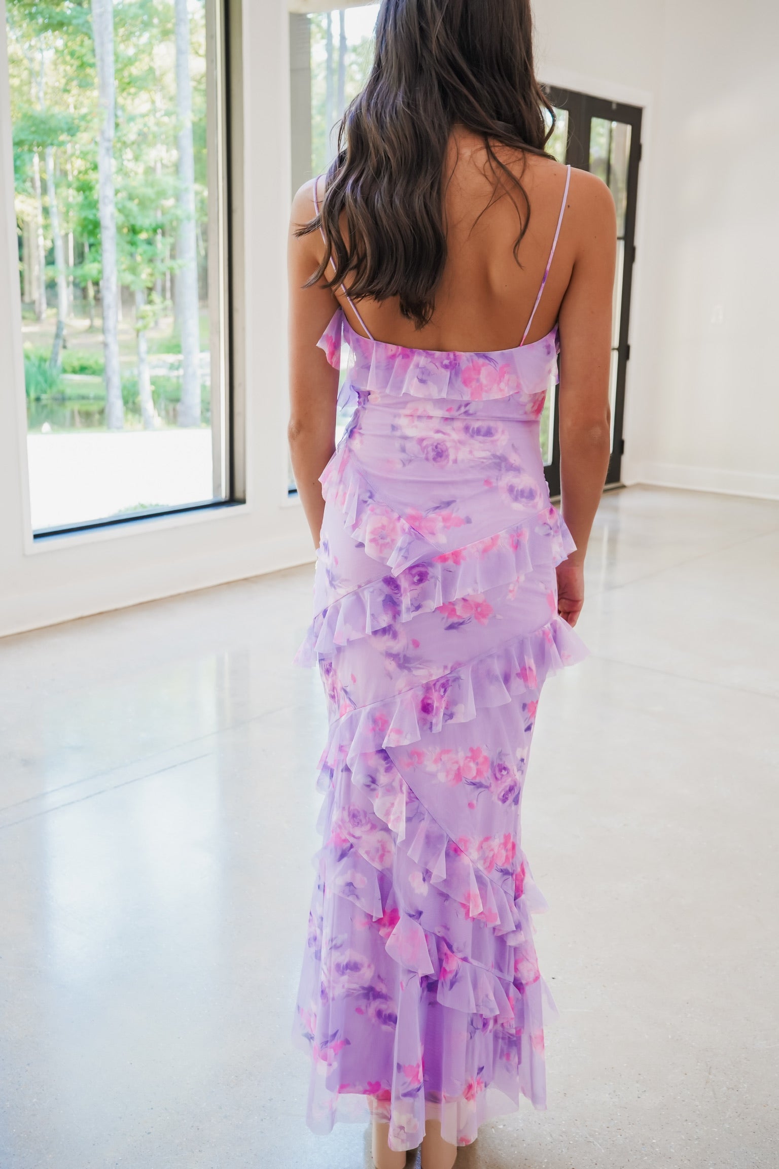 Embrace effortless charm in the Easton Maxi Dress, featuring a lavender purple mesh fabric adorned with delicate pink, white, and purple floral prints. This sleeveless bodycon dress boasts thin adjustable straps and a playful ruffle asymmetric detail that adds a flirty twist to your look. Perfect for sunny days or evening outings, it combines comfort and style with a fun, feminine flair.