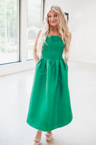Elevate your wardrobe with the Elisabeth Midi Dress in stunning emerald. This sleeveless, strapless design features a vertical pleated bodice that flatters your silhouette, while the smocked back ensures a comfortable, secure fit. A hidden zipper closure adds a seamless finish, making this dress perfect for any elegant occasion. Embrace effortless style and confidence in this timeless piece.