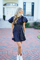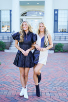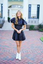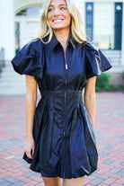 The Elodie Dress is perfect for adding some edgy elegance to your wardrobe. Made of black faux leather, it features short puff sleeves, a collared neckline, and a full silver front zipper closure. The cinched waistline and bubble hem add flattering details, making it a must-have for any fashion-forward individual!