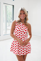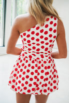 The Eugenia Romper in classic red and white features a stylish one-shoulder design and a playful bubble balloon hem that adds unique flair. Its timeless polka dot pattern brings a fun, retro vibe, making it perfect for standout summer looks or special occasions. Comfortable and eye-catching, this romper effortlessly blends bold style with feminine charm.