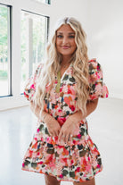 Brighten your wardrobe with the Everest Dress, featuring a colorful watercolor floral print that captures attention effortlessly. This shift mini dress is designed with a flattering split notch V-neckline and charming puff sleeves, enhanced by a contrasting olive green trim for a unique touch. Perfect for warm days or casual outings, its comfortable fit and eye-catching details make it a versatile choice to elevate your style.