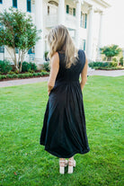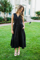Step into effortless charm with the Gianna Midi Dress! This black sleeveless piece features a playful scalloped V-neckline and a front button closure that adds flirty detail. Handy side pockets keep essentials close, while the back smocked waistband offers a comfortable, flattering fit. Perfect for days when you want to feel both stylish and at ease.