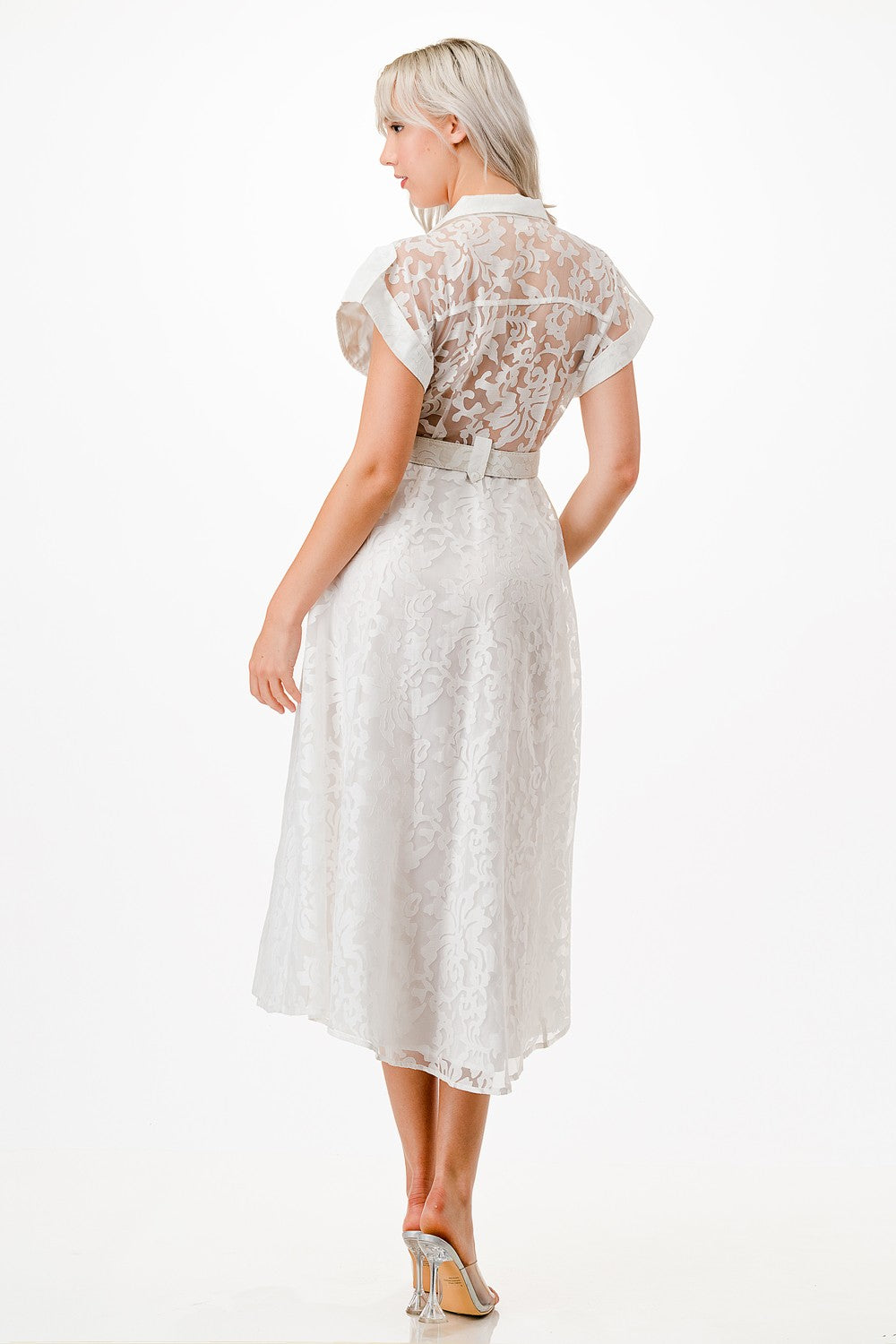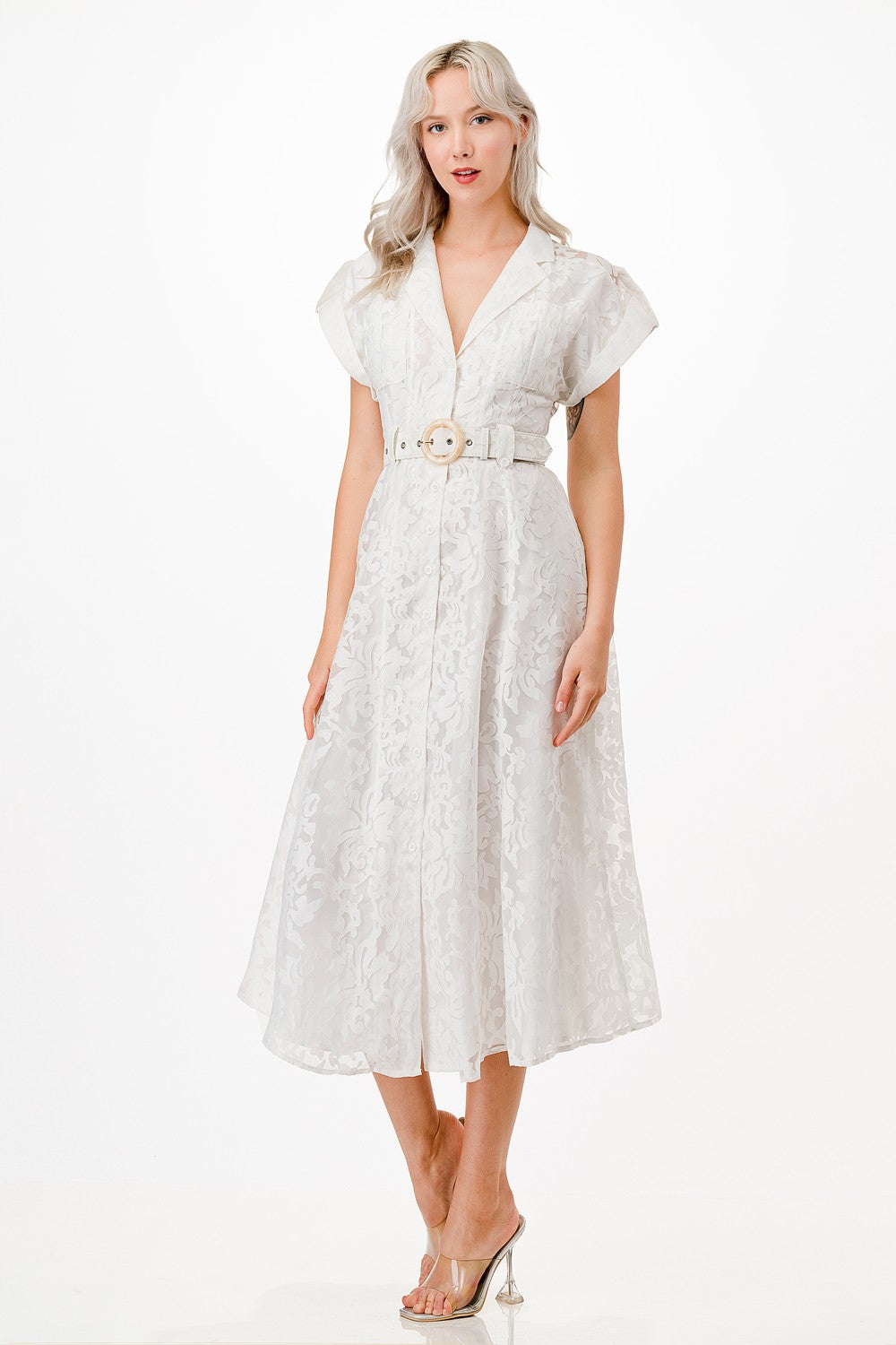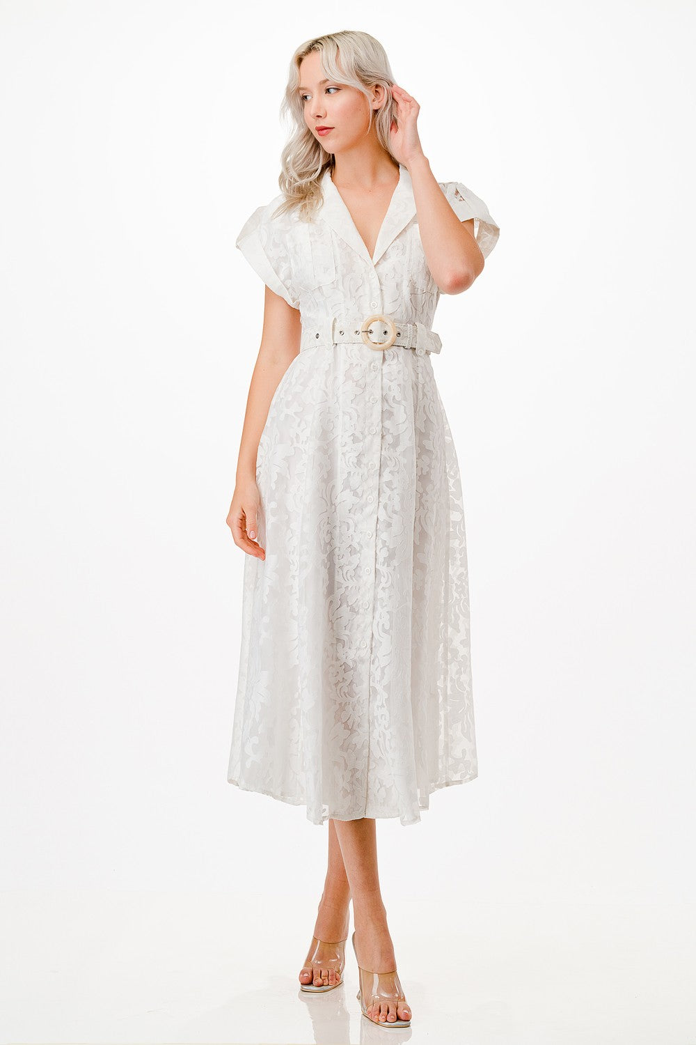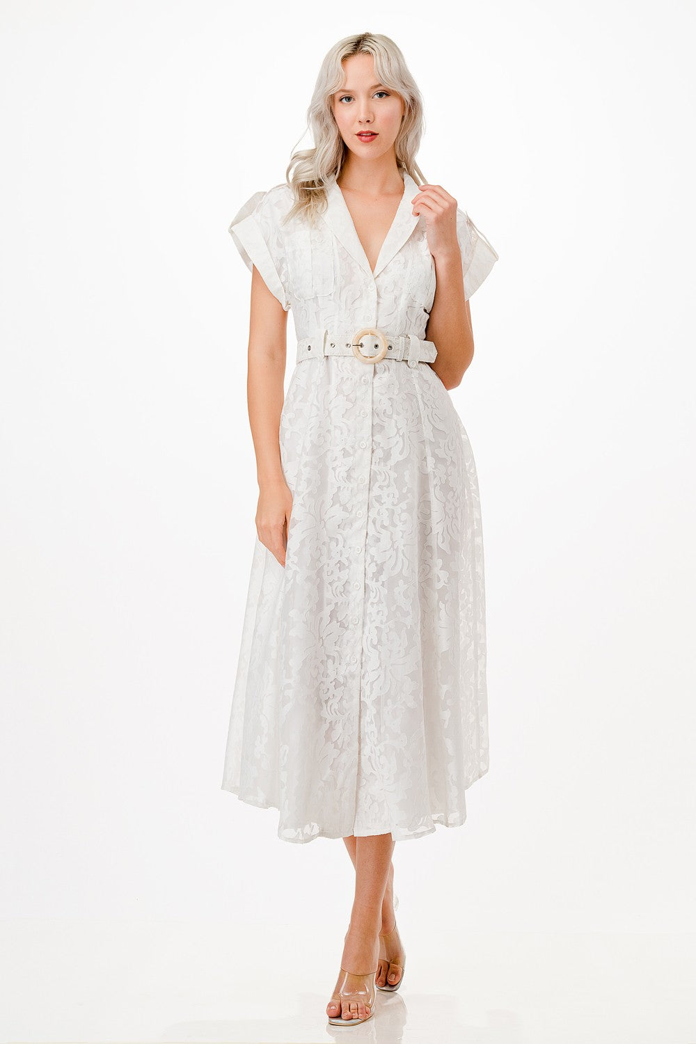 Step out in style with the Gina Dress in Off White. This playful midi dress features short sleeves, a crisp collar, and a button-down front, making it effortlessly chic. The included belt cinches your waist for a flattering silhouette, perfect for everything from brunch dates to garden parties.