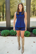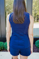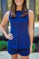 Bring fun and effortless style to your wardrobe with the Harper Set! This navy blue duo features a tailored sleeveless top with a sleek hidden front button closure, perfectly paired with breathable cotton poplin shorts. The A-line cut offers a flattering fit that keeps you cool and confident, making it ideal for sunny days and spontaneous adventures.