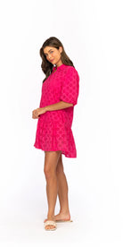 Enhance your wardrobe with the Heidi Magenta Dress. This stylish mini dress features eyelet details, puff sleeves, and a v-neckline with a collar. Perfect for any occasion, this dress offers a modern and elegant look. Elevate your style with this must-have dress.