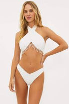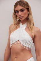 The Jessica Top is a crisscross halterneck top with a tie-neck and back clasp closure. Now in our smooth Ivory fabric, with silver pearl embellishments and fringe hem. Pair with the matching Vanessa Bottom and Cassie Skirt in Ivory Pearl.