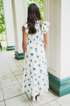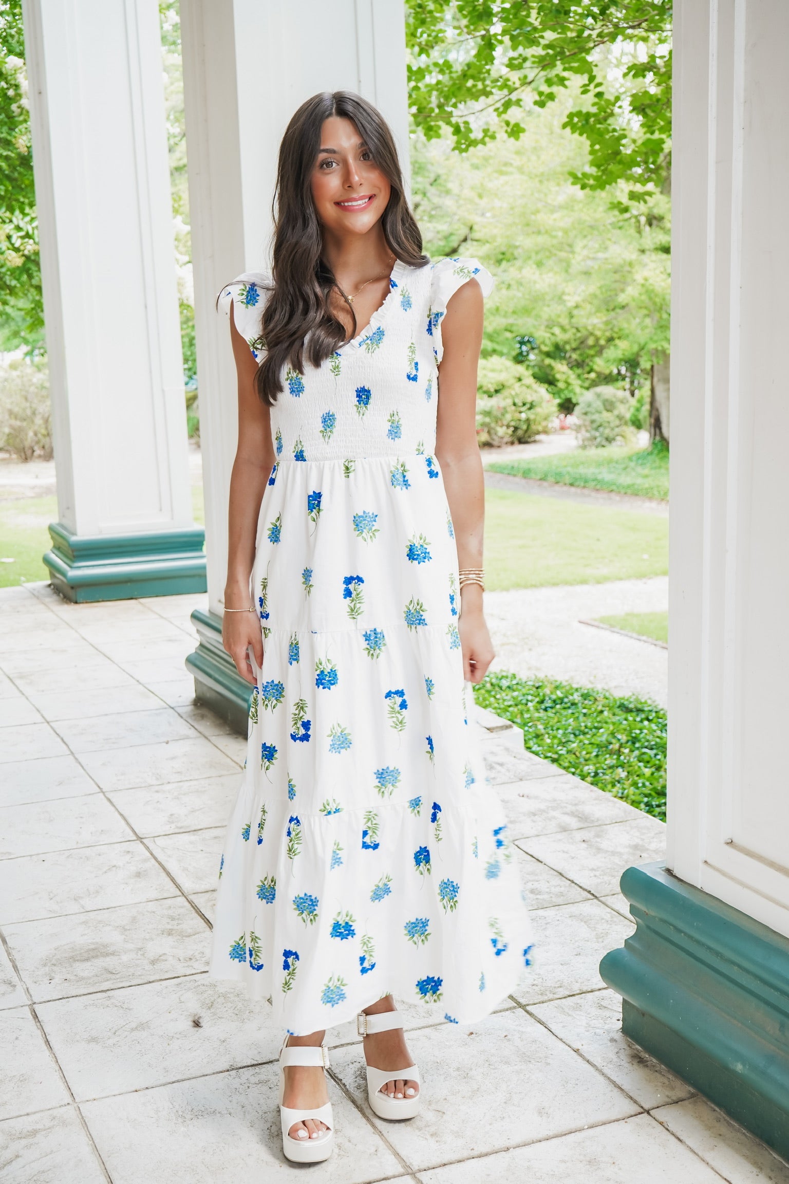The Jillian Midi Dress is a playful blend of comfort and charm with its white ruffle cap sleeves and smocked bodice. Adorned with a blue and green flower bouquet print, it features a ruffle v-neckline and a tiered skirt that moves with you. Perfect for sunny days or casual outings, this dress brings a fresh, flirty vibe to your wardrobe.