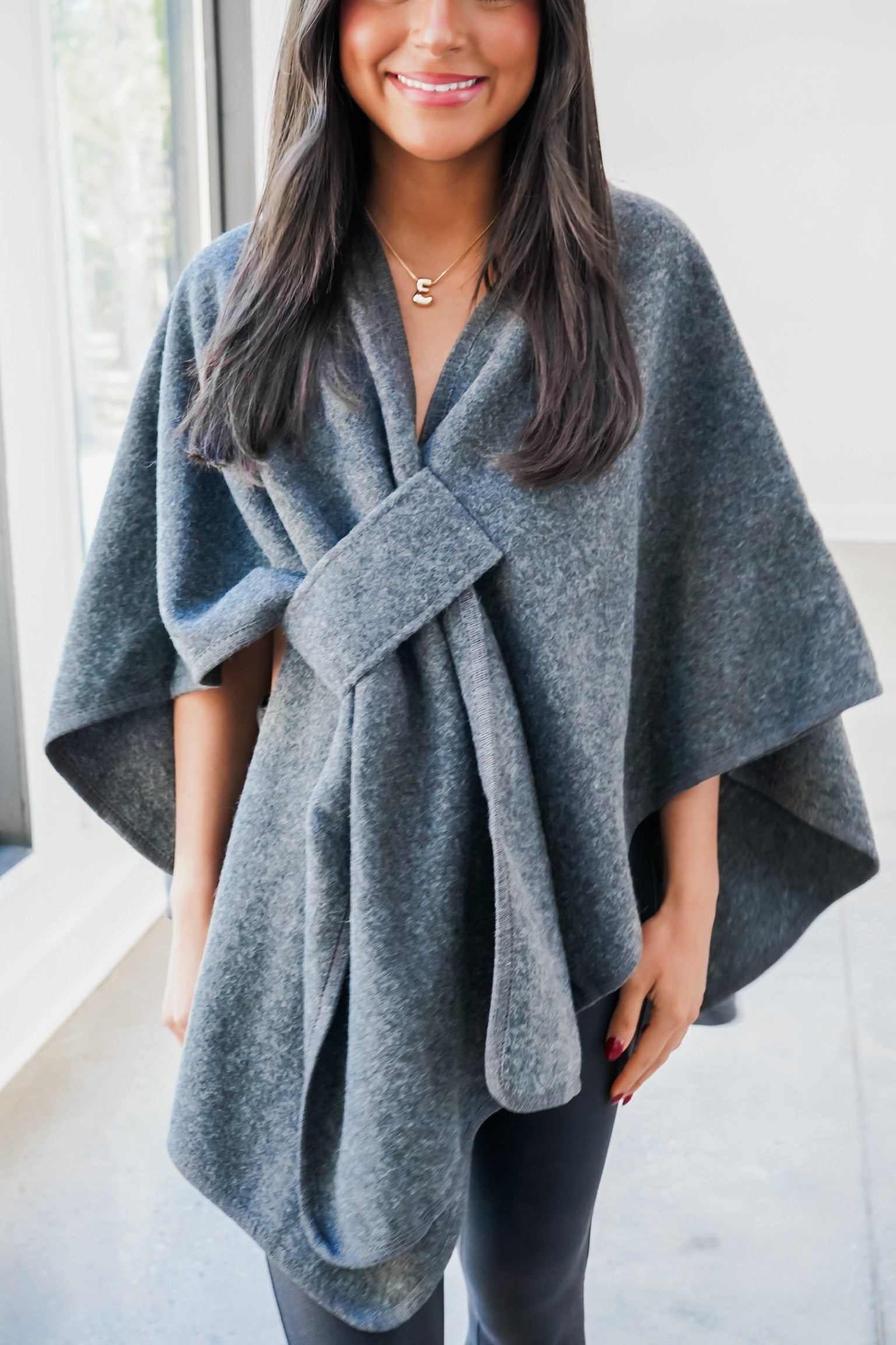 Stay warm in elegant style with our Knit Shawl Wrap. Designed with a pull-through front closure, it boasts a chic asymmetrical silhouette, blending the best elements of a cape, poncho, and shawl. Its soft knit makes it perfect for fall, ensuring you remain both cozy and fashion-forward.