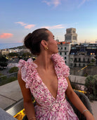 Step into summer with the Kris Maxi Dress in pink, designed to turn heads with its playful ruffles and flirty open back. Lightweight and breathable, this dress keeps you comfortable from beach parties to weddings. The chic high slit and flattering V-neckline add a touch of elegance while celebrating your silhouette. Perfect for sunny days and warm nights!