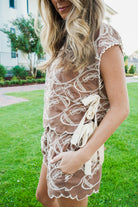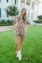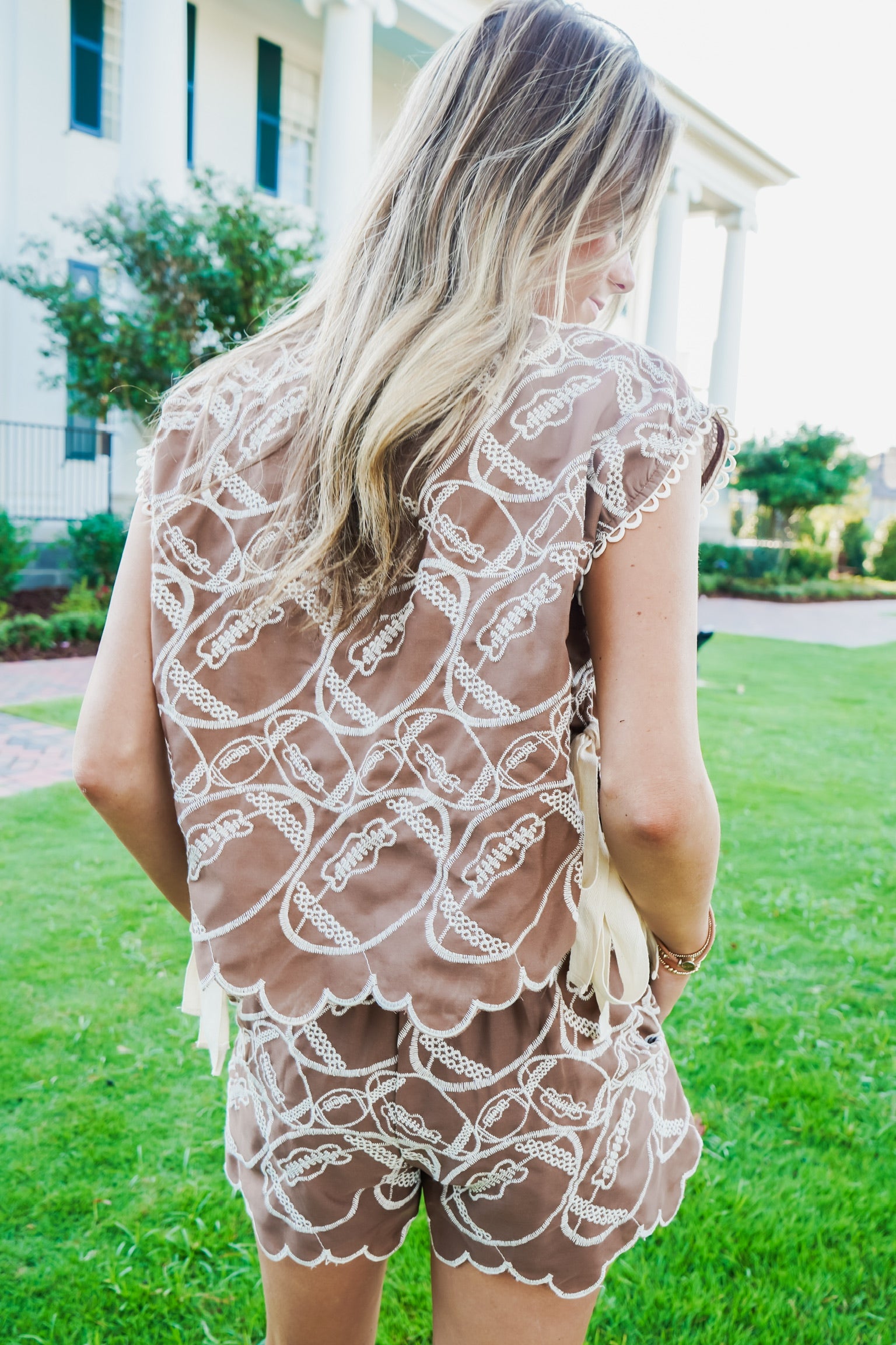 Embrace playful charm with the Kristen Set, featuring a light brown sleeveless boxy top trimmed with delicate white scallops. The side adjustable bow closure adds a flirty open detail, while a stitched football icon brings a sporty twist. Paired with matching scallop-hem shorts and a comfy elastic waistband, this set blends comfort and cute for your laid-back days.