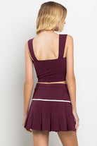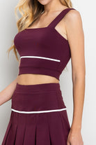 Show off your fun and sporty side with the Kyndall Top. This burgundy tank features white piping details for an extra pop. The cropped length adds a touch of athleisure to any outfit. Get ready to turn heads with this playful top! (FINAL SALE)
