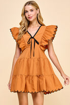 Introducing the Leva Dress in Camel! This playful dress features a V-neck, cute bow detail, and charming scalloped poplin ruffle sleeves. Perfect for adding a touch of fun to any occasion!