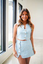Inspire envy in this sleek and stylish Lorenza Set! Featuring a jacquard sleeveless top with intricate puzzle piece design and statement gold button detailing. Paired with a matching mini skort, complete with a back zipper for a flawless fit. Upgrade your wardrobe with this must-have set!