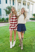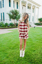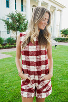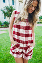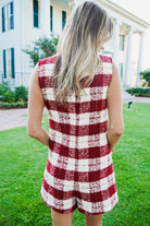 Introducing the Lucian Romper - a versatile statement piece that combines classic ivory and burgundy plaid tweed with a modern sleeveless design. Featuring a round neck and pockets with gold button detailing, this romper is both stylish and functional. Perfect for any occasion, stand out with confidence and make a bold statement with the Lucian Romper!