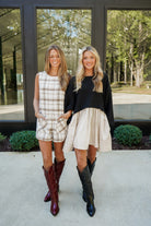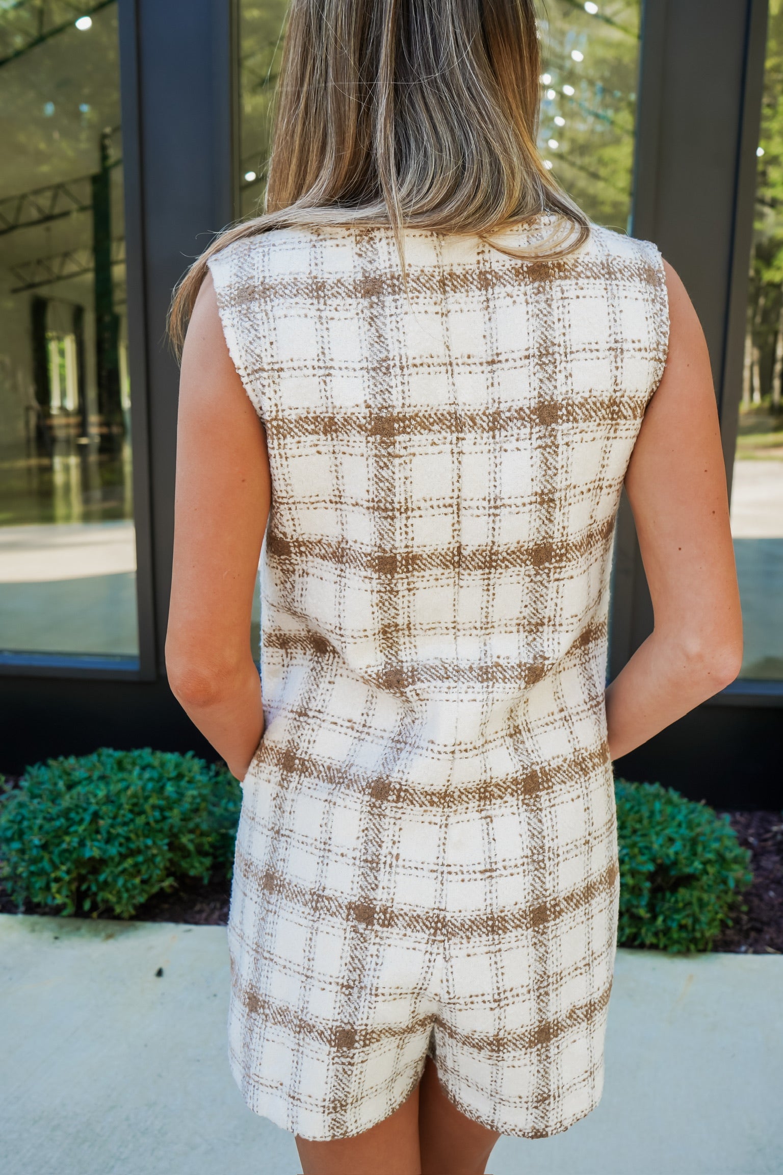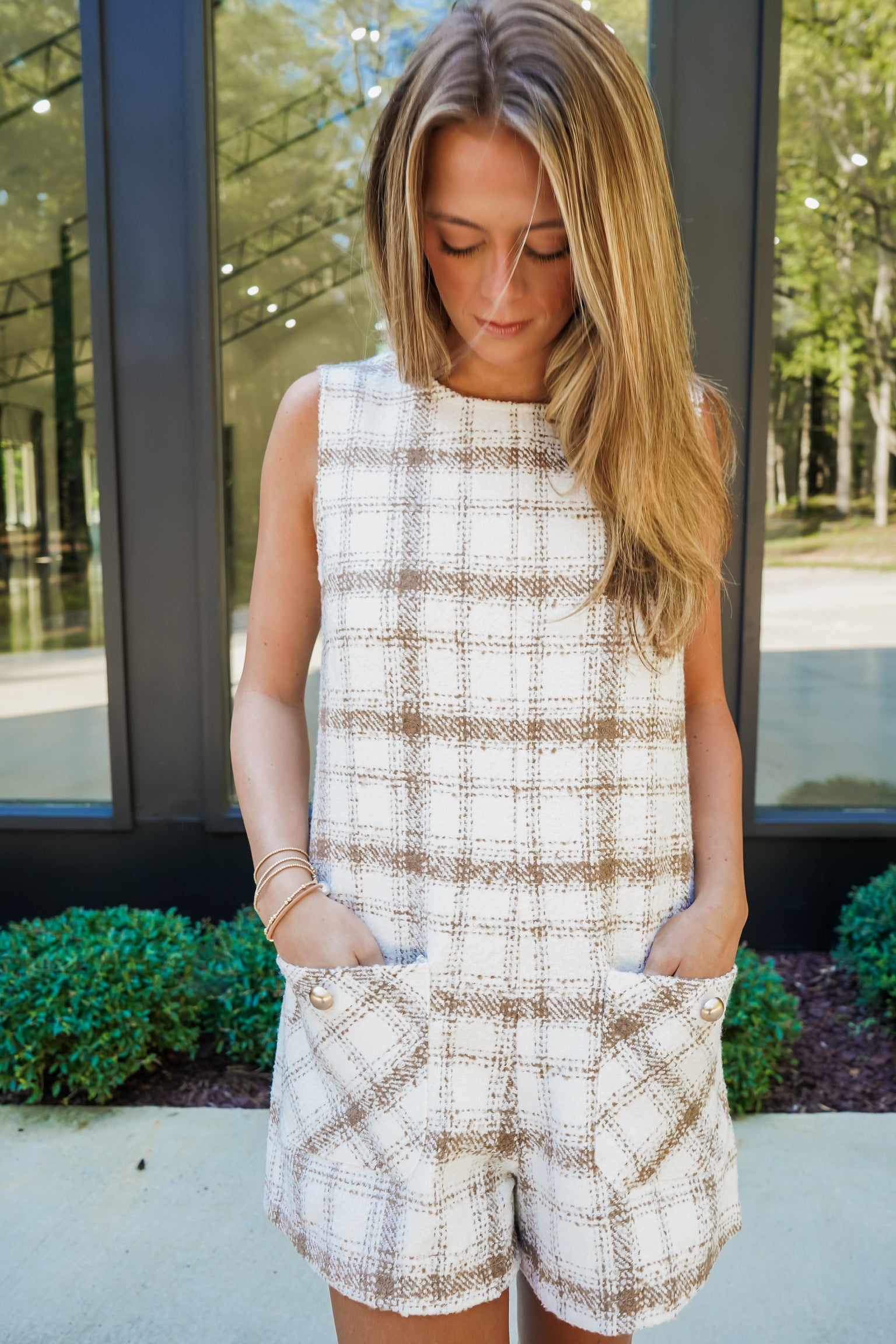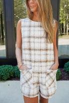 Introducing the Lucian Romper - a versatile statement piece that combines classic ivory and mocha plaid tweed with a modern sleeveless design. Featuring a round neck and pockets with gold button detailing, this romper is both stylish and functional. Perfect for any occasion, stand out with confidence and make a bold statement with the Lucian Romper!