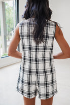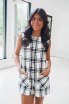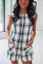 Introducing the Lucian Romper - a versatile statement piece that combines classic black and white plaid tweed with a modern sleeveless design. Featuring a round neck and pockets with gold button detailing, this romper is both stylish and functional. Perfect for any occasion, stand out with confidence and make a bold statement with the Lucian Romper!