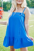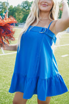Turn heads in the Lunden Mini Dress, featuring playful contrast white stitching and a flirty ruffle skirt hem. This sleeveless shift dress has a belted bodice and buckle closure, adding a fun, edgy touch to your look. Perfect for sunny days and casual nights out!