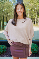 Add a playful edge to your wardrobe with the Lurleen Mini Skirt. Crafted from wine-colored faux leather, this fitted mini skort hugs your curves while the front tie detail adds a flirty, fun twist. Perfect for elevating any look with a touch of bold style.