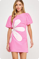 The Marcy Mini Dress in pink and off-white combines playful charm with delicate details. Made from soft cotton poplin, it features a flirty side cutout with an adjustable tie, short puff sleeves, and shirred shoulders for a comfortable fit. The feminine patchwork flower detail and round neckline add a sweet touch, while the lining ensures smooth wear from day to night.
