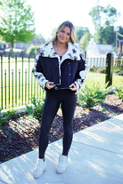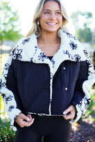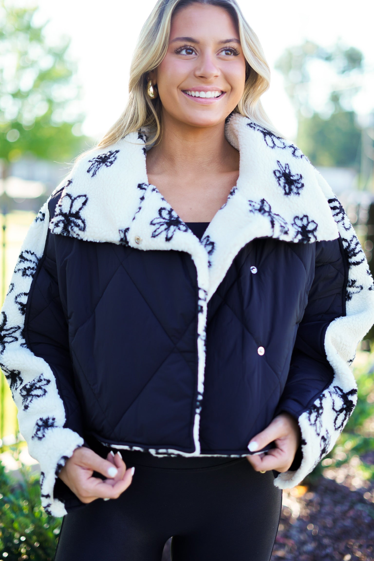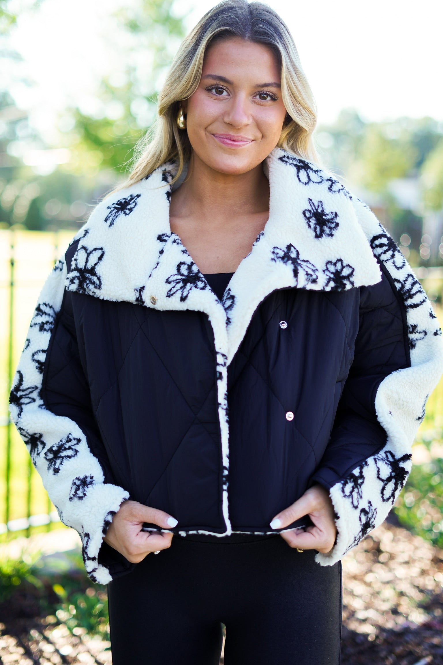 Stay warm and stylish with the Margot Jacket! Made with quilted black puffer material and featuring a fluffy cream shearling collar, this jacket is both cozy and chic. The daisy flower print and snap button front closure add a unique touch to this must-have outerwear. Don't sacrifice fashion for function - the Margot Jacket has it all!